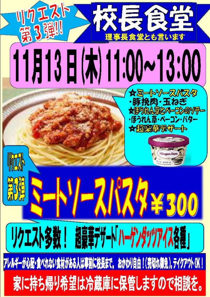 11月13日(木)校長食堂開店!!メニューはミートソースパスタとスペシャルデザート!