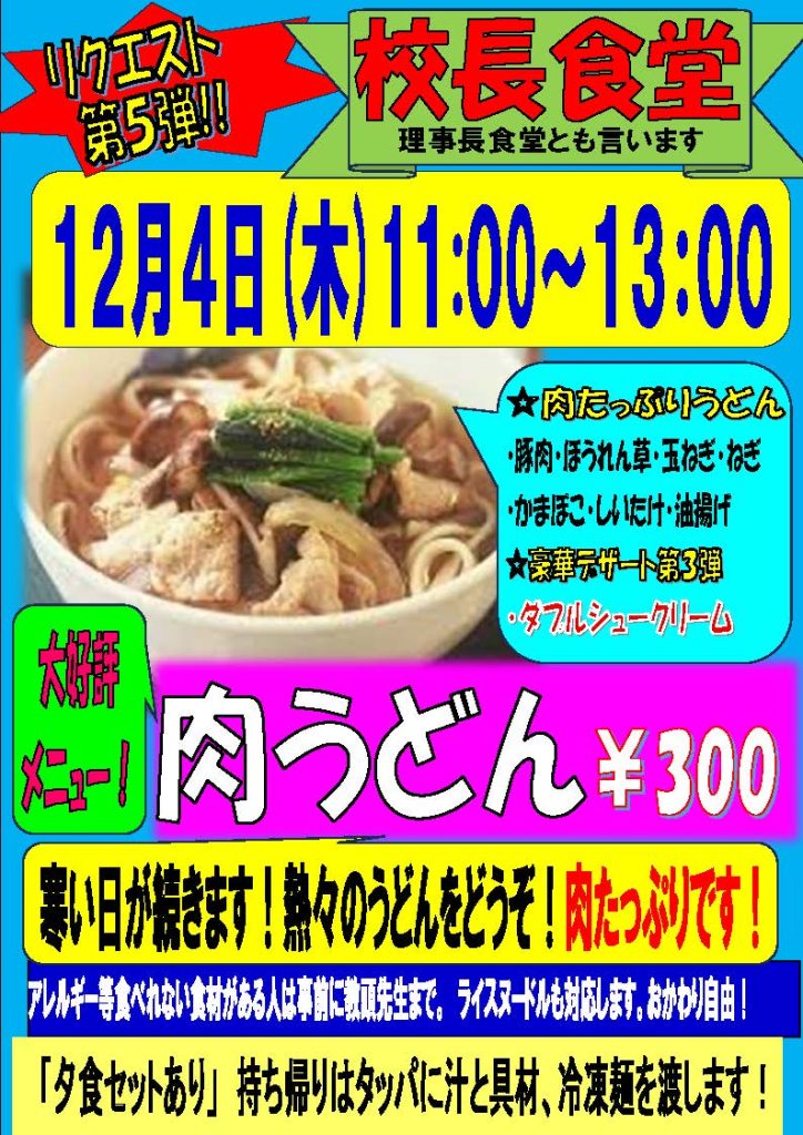 12月4日(木)校長食堂開店!!メニューは肉うどんとスペシャルデザート!