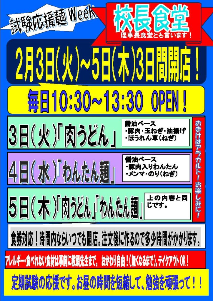 2月3日(火)~5日(木)校長食堂開店!!試験応援麺Week!